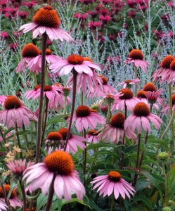 Many varieties of Coneflowers bloom from June through August such as Echinacea purpurea ‘Magnus’